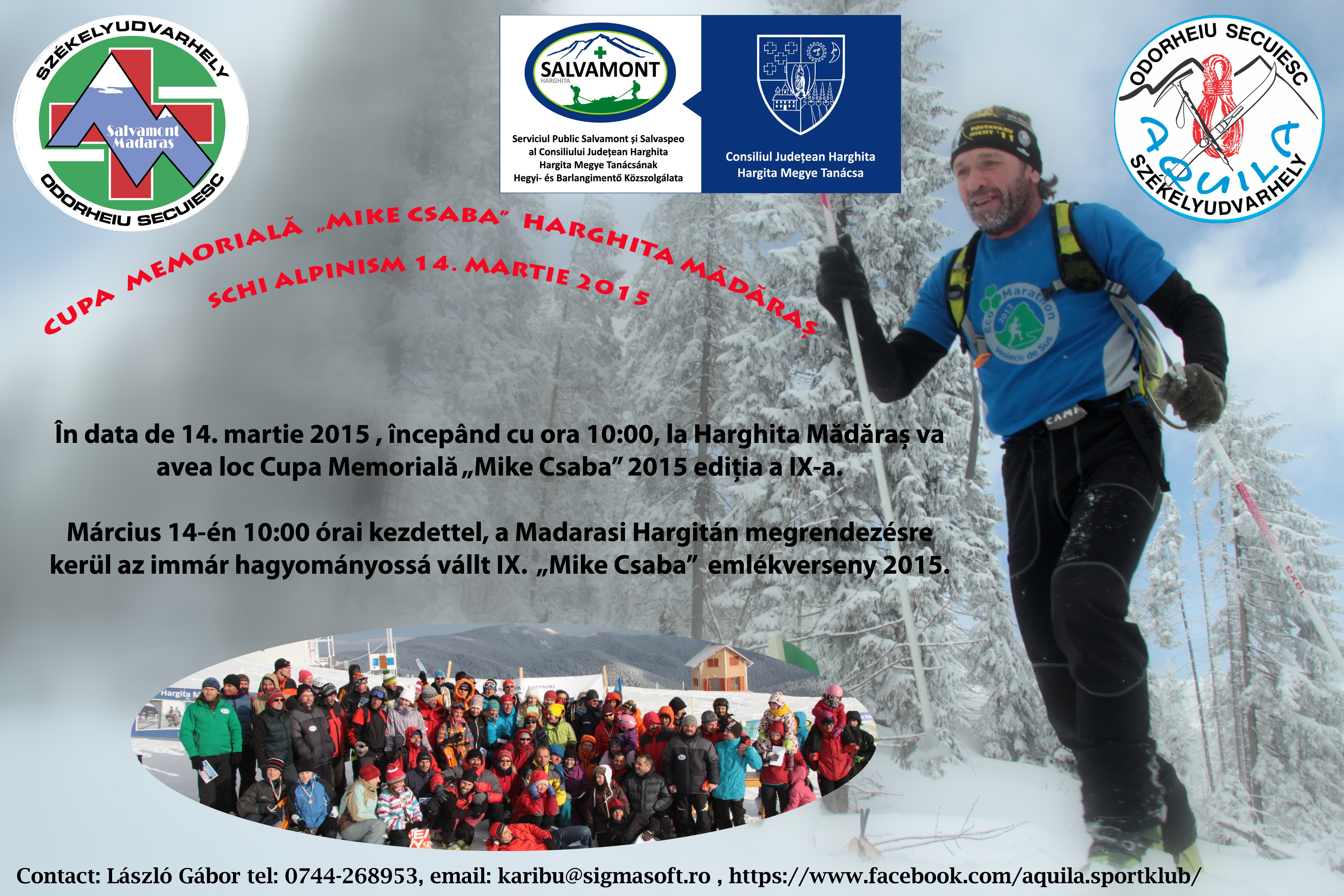 Március 14-én, szombaton 9 óra 30 perckor kezdődik a Madarasi Hargitán az immár hagyományossá vált Mike Csaba Emlékverseny. A versenyt az AQUILA SK és a székelyudvarhelyi HARMONT Hegyimentő Egyesület szervezi, Hargita Megye Tanácsa Hegyi- és Barlangimentő Közszolgálatának és Hargita Megye Tanácsának partnerségével. Egyéni túrasíversenyről van szó, amelyen egy előre kijelölt, emelkedőkkel és ereszkedőkkel tarkított útvonalat kell megtenni, és egy via ferrata típusú útvonalat is meg kell mászni. Az immár 9. alkalommal megrendezett megmérettetést a tragikusan lavinabalesetben elhunyt hegymászó, hegyimentő kollégájuk emlékére szervezik a hegyimentők.